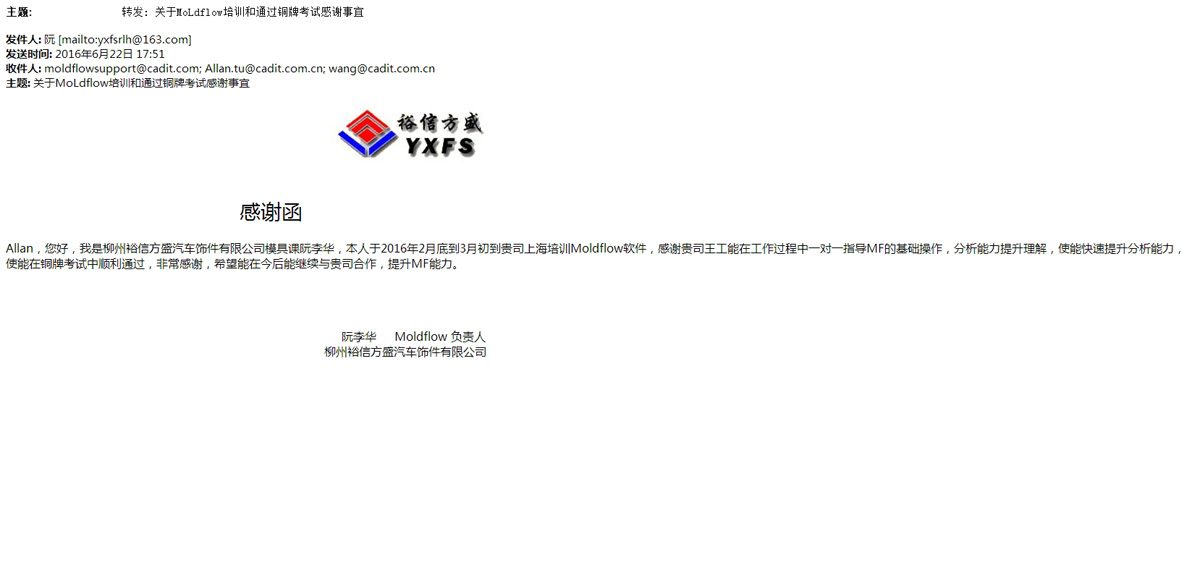寧波方正汽車模具有限公司-感謝函