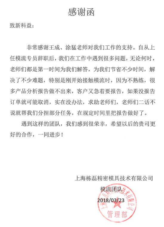上海棟磊精密模具技術(shù)有限公司-感謝函