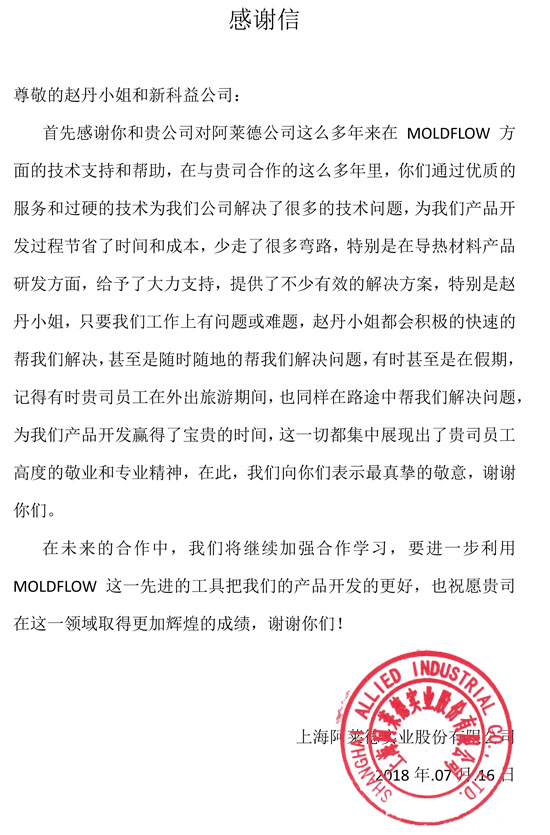 上海阿萊德實(shí)業(yè)有限公司-感謝函