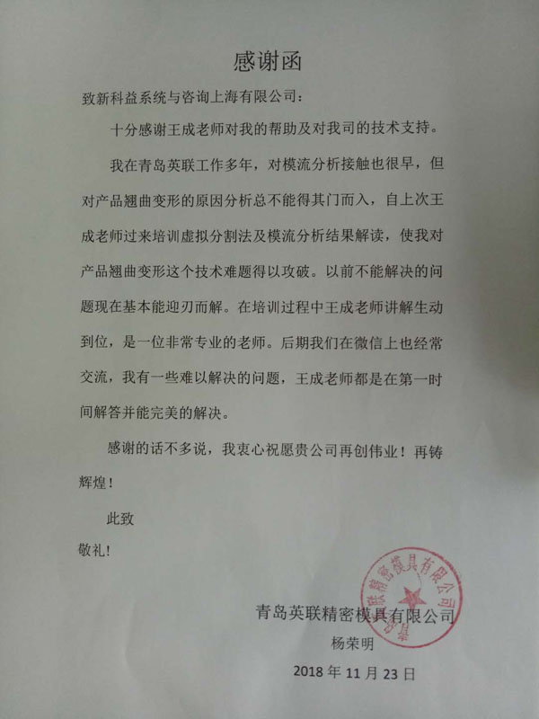 青島英聯(lián)精密模具有限公司-感謝函