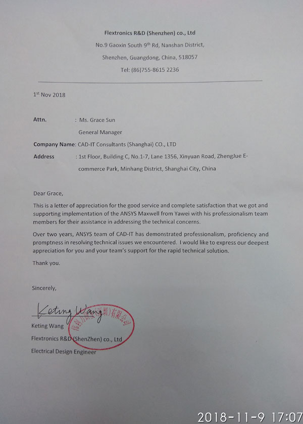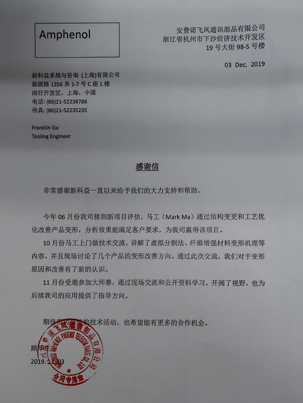 安費(fèi)諾飛鳳通訊部品有限公司-感謝函