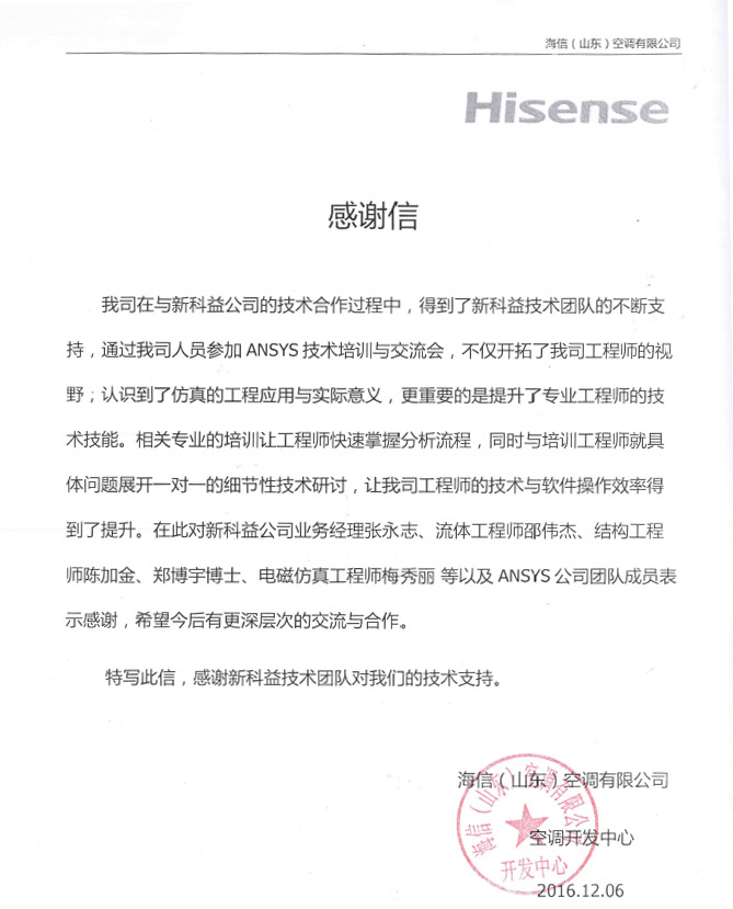 海信(山東)空調(diào)有限公司-感謝函