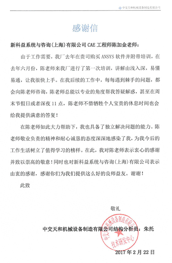 中交天和機(jī)械設(shè)備制造有限公司-感謝函
