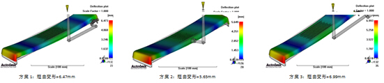 結(jié)論:3種方案變形結(jié)果都很大,都不合格。 因為此車燈反射鏡后續(xù)需要與燈體通過波峰焊連接,如果變形大會影響焊接效果,所以必須把產(chǎn)品變形控制在公差允許范圍之內(nèi)。 通過Moldflow變形影響因素隔離,發(fā)現(xiàn)收縮不均是導致產(chǎn)品變形的主要因素,因此我們的改善方向是調(diào)整產(chǎn)品結(jié)構(gòu)(壁厚),直到收縮均勻;此時如果繼續(xù)優(yōu)化澆口位置或者水路排布,對變形的改善幾乎沒有效果,所以Moldflow對變形的優(yōu)化方向具有指導意義。