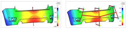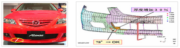 如下馬自達(dá)汽車保險(xiǎn)杠經(jīng)過噴涂之后縫合線明顯,通過改善局部壁厚如右圖,應(yīng)用Moldflow分析確認(rèn)角度大于75度,為不可見縫合線。