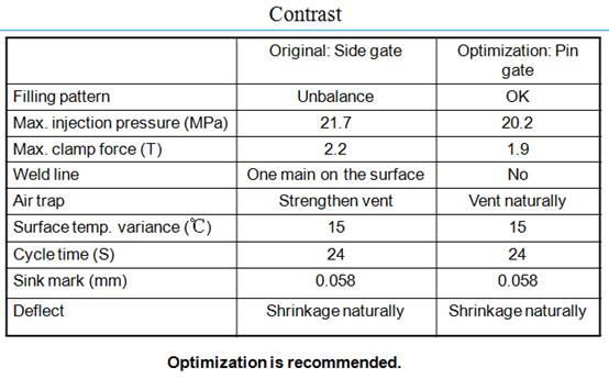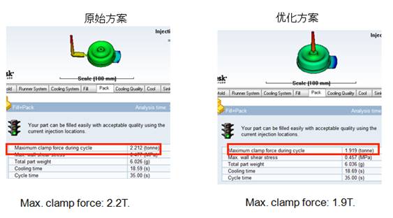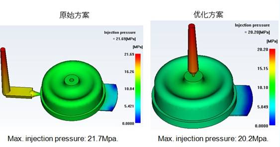 優(yōu)化澆口位置改善工藝條件 原始方案采用單點(diǎn)側(cè)進(jìn)膠,壓力損失較大,我們通過(guò)優(yōu)化進(jìn)膠方式和位置,采用單點(diǎn)進(jìn)膠方式,從而優(yōu)化了工藝條件,得到理想成型工藝。 優(yōu)化流道系統(tǒng)改善充填平衡的問(wèn)題 如下為汽車(chē)橡膠配件,原始方案中我們可以看到充填不平衡,我們知道,充填的平衡型直接影響到制品的精度。所以我們利用Moldflow軟件執(zhí)行流道平衡分析,通過(guò)右圖優(yōu)化后的方案可以看出,整個(gè)填充過(guò)程幾乎達(dá)到平衡狀態(tài),符合模具設(shè)計(jì)原則。 |
